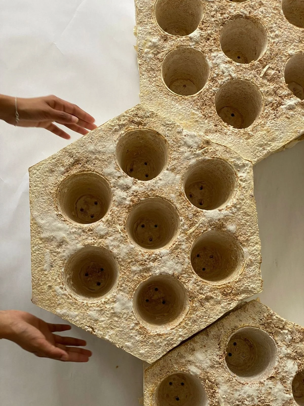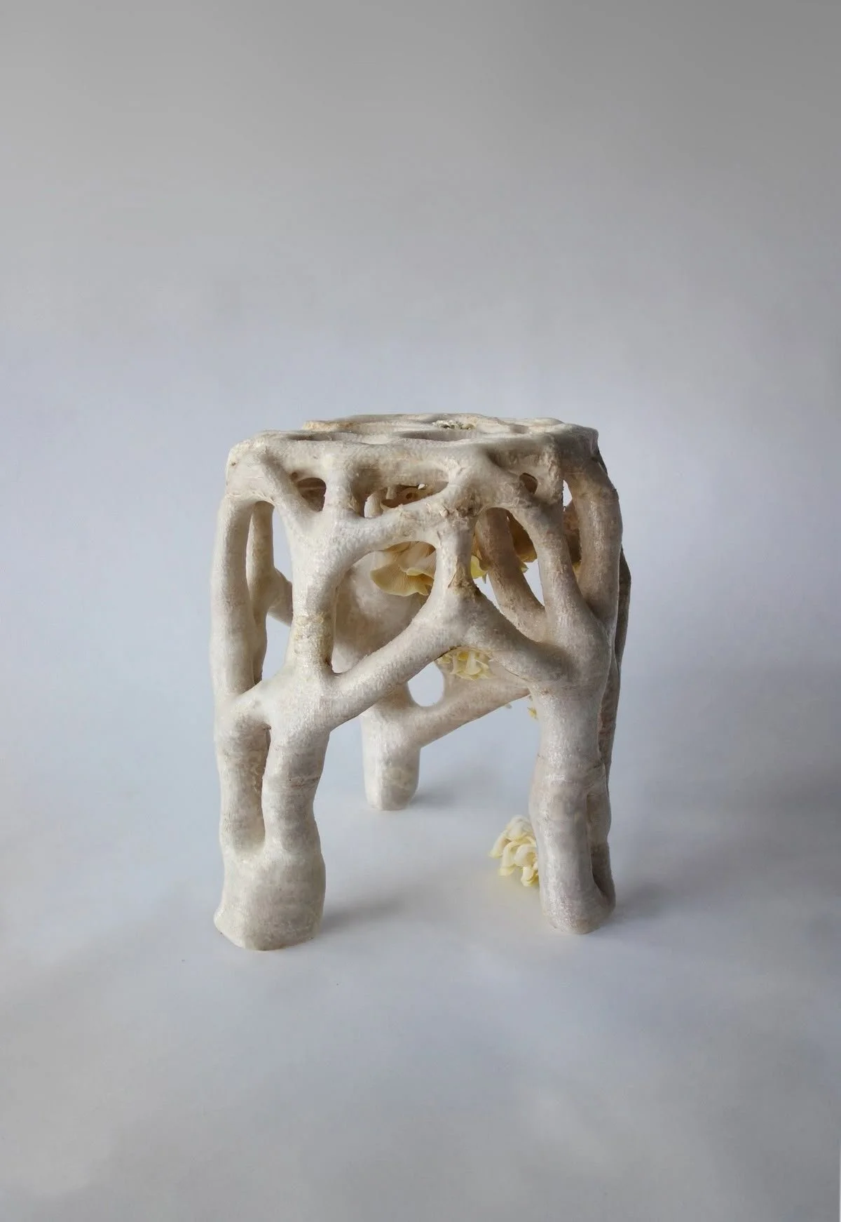 Indicative material references: mycelium composites and bio-fabricated forms demonstrating growth-led structure, surface texture and organic transformation.