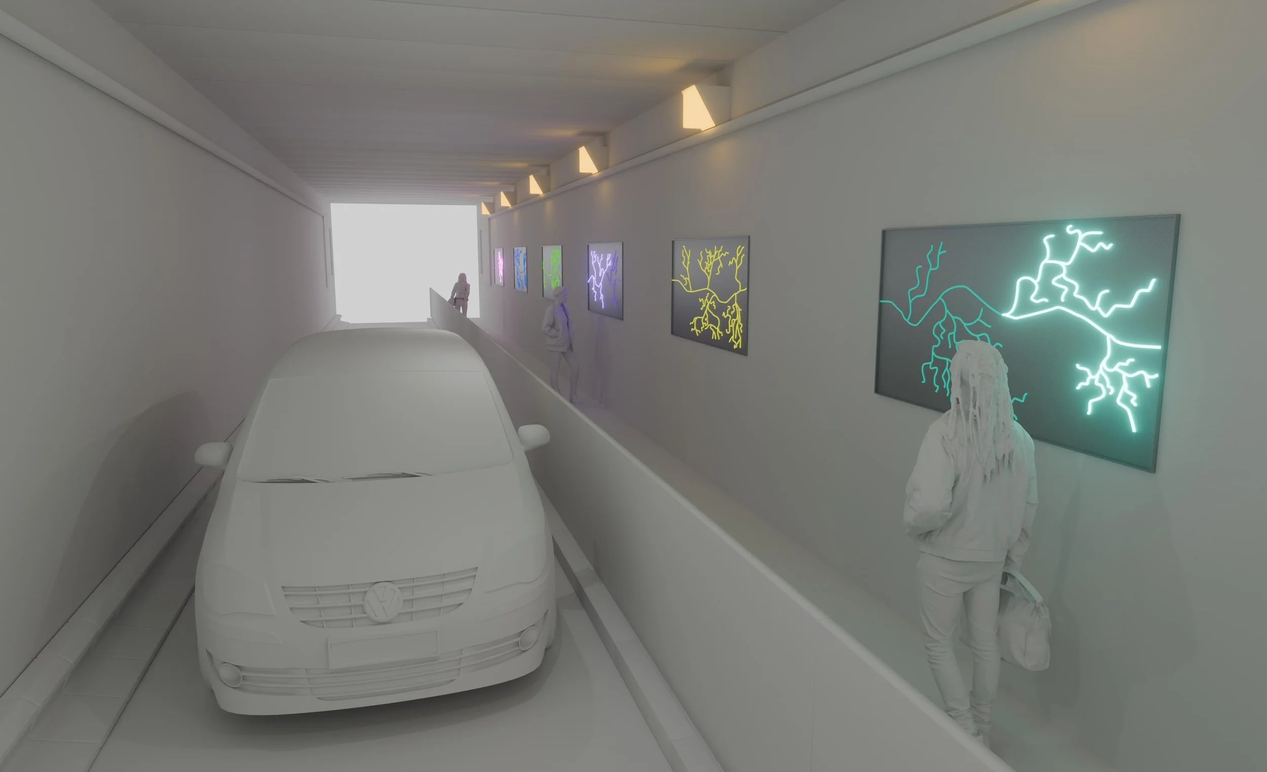 ROUTES translates natural systems — including root structures and mycelium networks — into an interactive public artwork that responds to human movement. Commissioned by South Oxfordshire District Council for a heavily used site in Didcot, the work uses light as a guiding and safety-enhancing presence within the underpass environment.